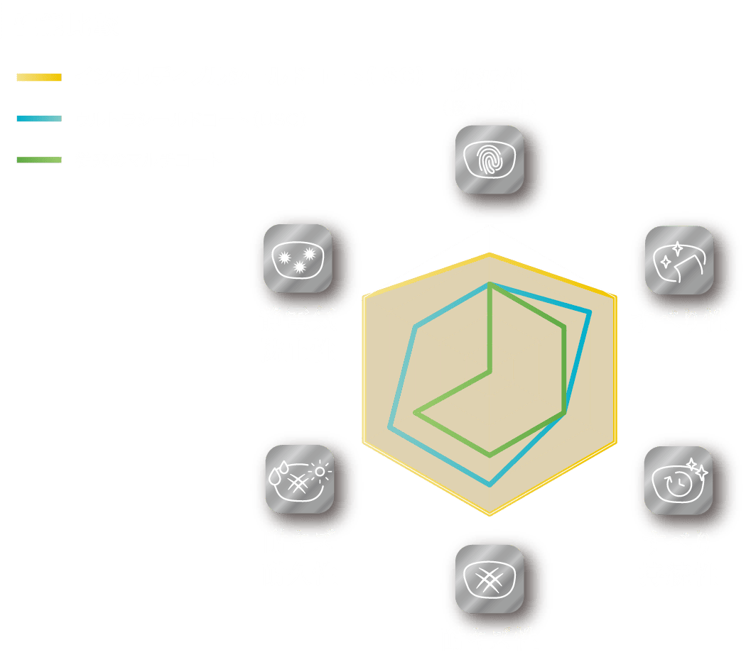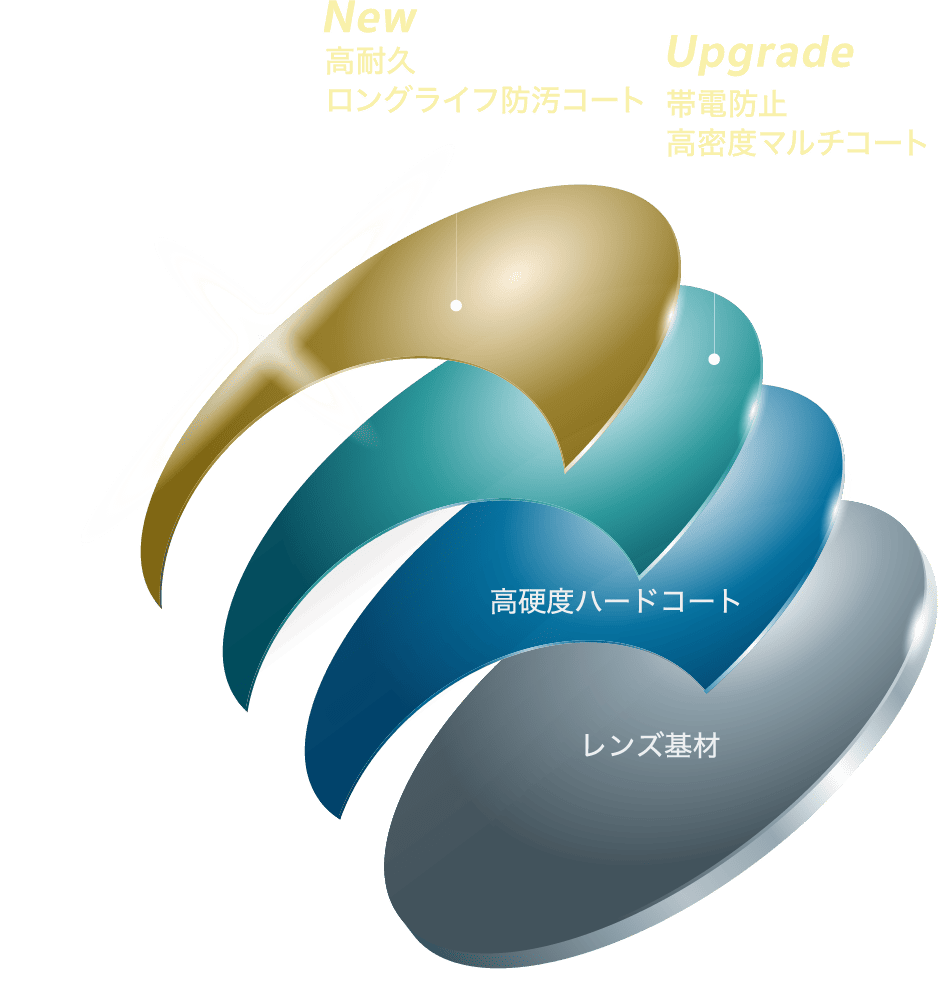 新たに開発した防汚層は、撥水性・撥油性とともに、持続的に優れたすべり性能を発揮します。この優れたすべり性能により、耐キズ性と高機能を維持する耐久性が実現されています。さらに、マルチコートの改良により、静電気防止機能も向上しています。