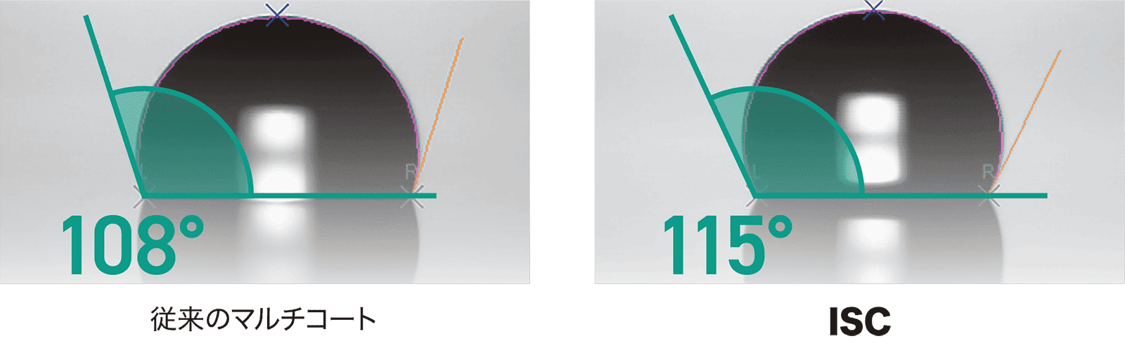 落とした水滴とコーティング表面で形成される角度「接触角」が大きいほど弾きやすいことを表します。