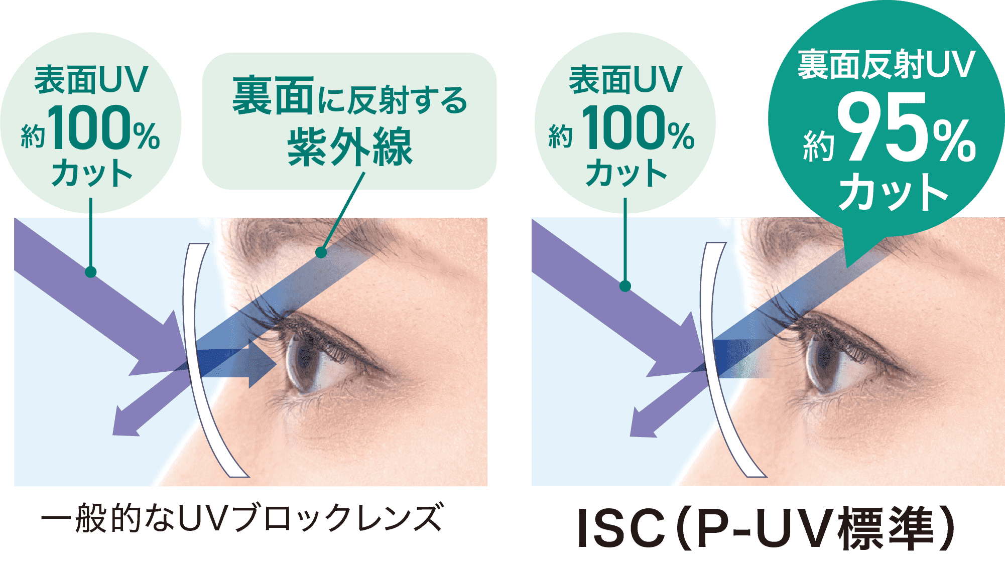 一般的なUVブロックレンズでも防げないレンズ裏面に反射する紫外線をブロック。