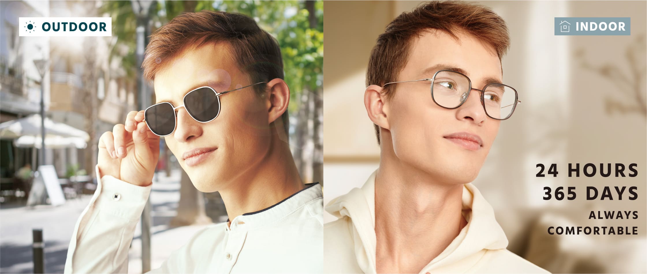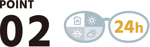 ルティーナ素材の調光レンズで、24時間あらゆるシーンをカバーして、いつでもどこでも1日中アイケアできるレンズです。