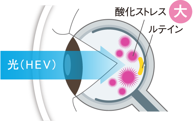 光(HEV)によって酸化ストレスをうけ、ルテイン劣化が起きやすい。