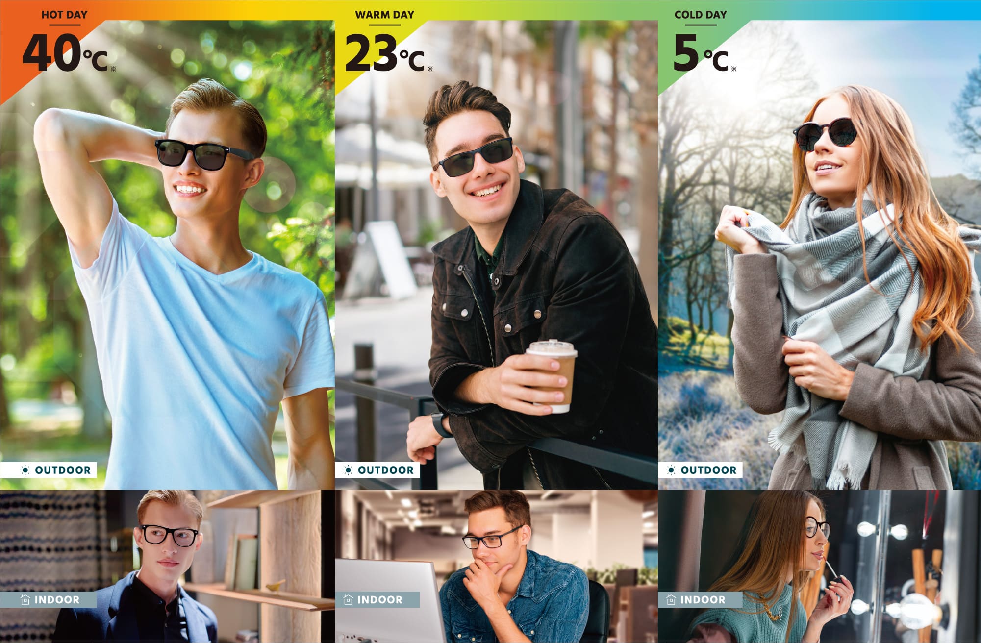 紫外線の量と温度によって濃度が変化し、まぶしさを軽減します。紫外線量が多いほど、温度が低いほど、色が濃くなります。